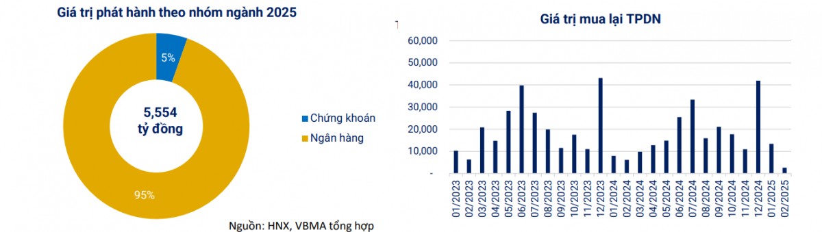 Trong tháng 2, các doanh nghiệp đã mua lại 2.592 tỷ đồng trái phiếu trước hạn, giảm 58% so với cùng kỳ năm 2024. Trong 10 tháng còn lại của năm 2025, ước tính sẽ có khoảng 192.267 tỷ đồng trái phiếu đáo hạn. Trong đó, phần lớn là trái phiếu bất động sản với 107.235 tỷ đồng, tương đương 54% tổng trái phiếu đáo hạn.