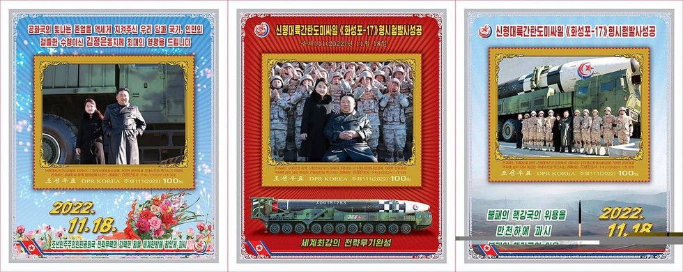 Trong đó, 5 con tem có in hình cô bé Kim Ju-ae xuất hiện với nhà lãnh đạo Kim Jong-un trước công chúng tại các sự kiện như lễ phóng thử tên lửa đạn đạo liên lục địa Hwasong-17 vào tháng 11 năm ngoái, chụp ảnh với cha trước một tên lửa trên bệ phóng và chụp ảnh cùng quân đội.