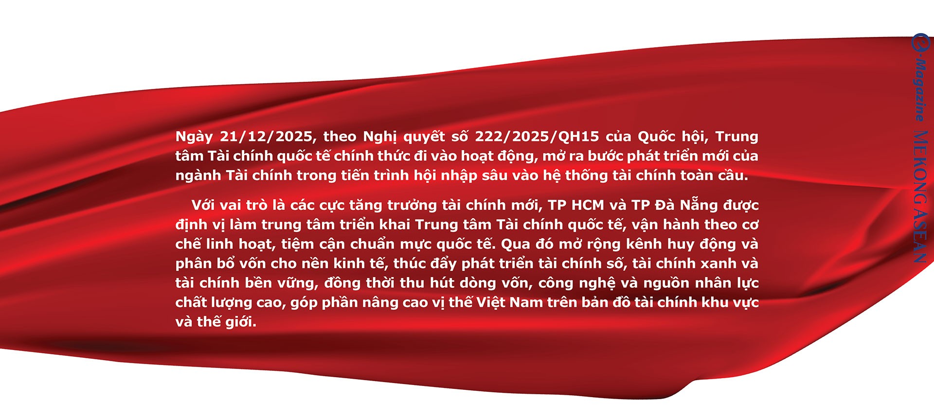Chia sẻ với Mekong ASEAN, PGS.TS Nguyễn Hữu Huân - Phó Chủ tịch Cơ quan điều hành IFC tại TP HCM nhận định, việc thành lập Trung tâm Tài chính Quốc tế không đơn thuần là một thiết chế tài chính mới, mà đóng vai trò như hạ tầng huy động và phân bổ vốn, giúp Việt Nam mở rộng không gian huy động vốn vượt ra khỏi biên giới quốc gia, đồng thời nâng chất lượng của nguồn vốn.