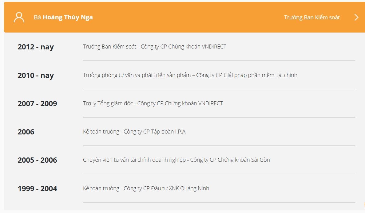 Sinh năm 1977, bà Hoàng Thúy Nga là cử nhân ngành tài chính ngân hàng – Đại học Kinh tế Quốc dân. Bà Hoàng Thúy Nga gắn bó với VNDirect từ những ngày đầu thành lập (năm 2007), đảm nhiệm các vị trí như trợ lý tổng giám đốc, trợ lý chủ tịch HĐQT. Vào năm 2012, bà trở thành Trưởng Ban kiểm soát VND và đảm nhận vị trí này từ đấy đến nay.