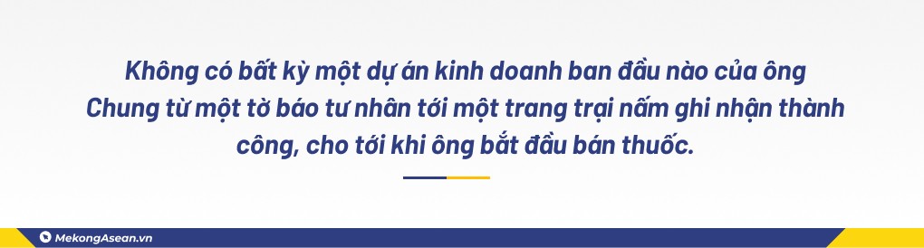 Tuy nhiên, khí hậu của Hải Nam không thuận lợi cho việc trồng nấm và chẳng bao lâu sau, ông Chung gặp thua lỗ. Sau đó, ông cũng gặt hái được thành công đầu tiên trong kinh doanh với hàng nghìn USD tiền lãi nhờ việc bán rèm cửa. Tuy nhiên tất cả lại "của thiên trả địa" khiến ông mất tất cả khi quyết định lao vào ngành chăn nuôi tôm.
