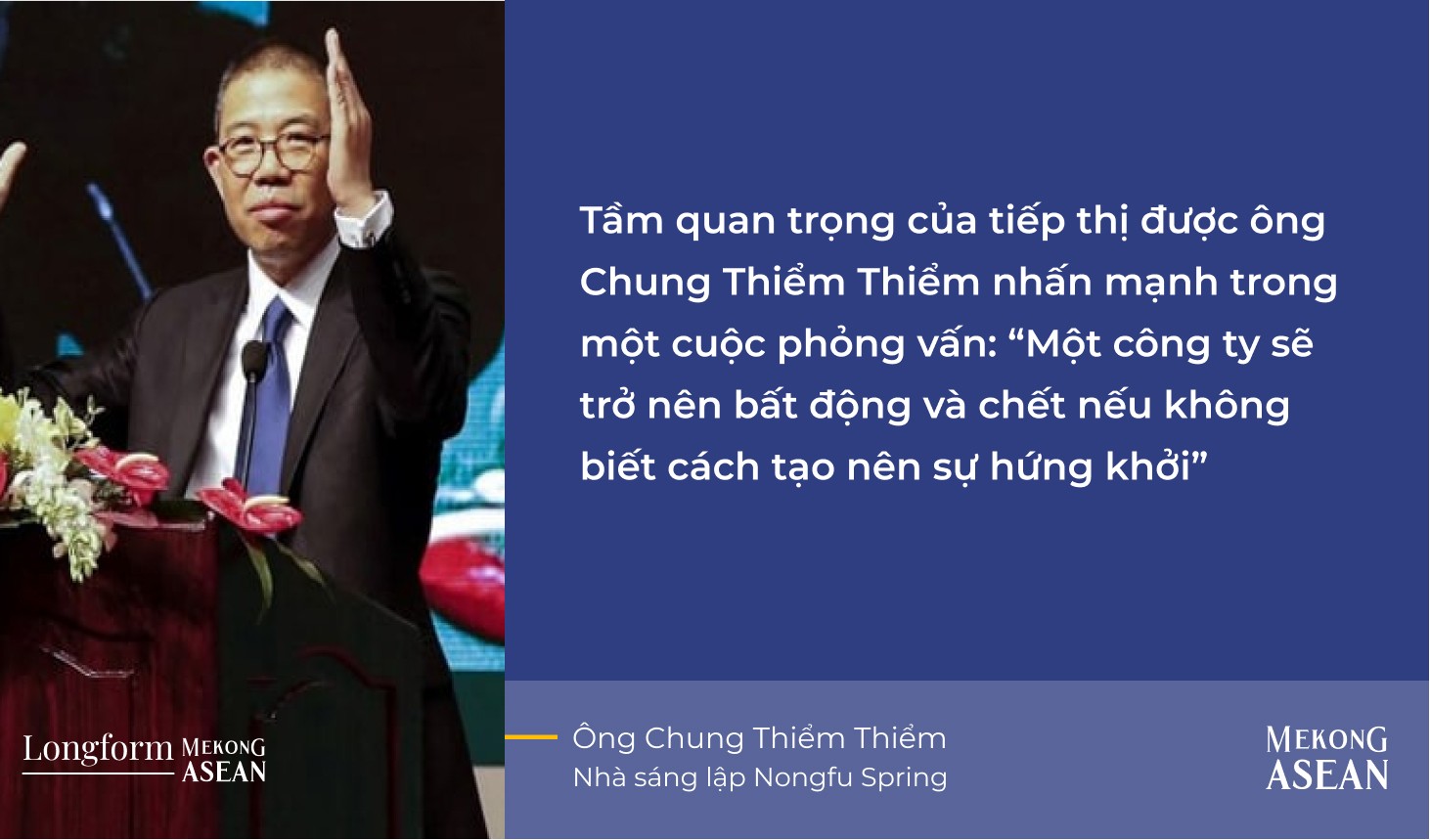 Trước đó vào thời điểm thành lập, sự xoay trục kinh doanh của ông Chung là một nỗ lực gần như chắc chắn sẽ thất bại do thị trường lúc đó đã được thống trị bởi những công ty lớn nổi tiếng. Phương pháp giải quyết của ông chính là quảng cáo Nongfu như một lựa chọn nước khoáng lành mạnh có nguồn gốc từ các hồ và suối tự nhiên với độ tinh khiết cao. Các sản phẩm của công ty do đó khác với các sản phẩm nước uống hóa học mà các đối thủ cạnh tranh của ông đang bán.