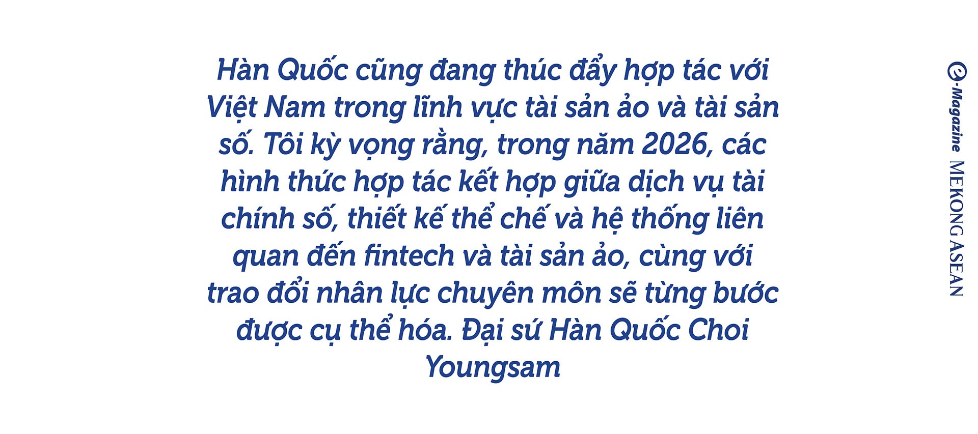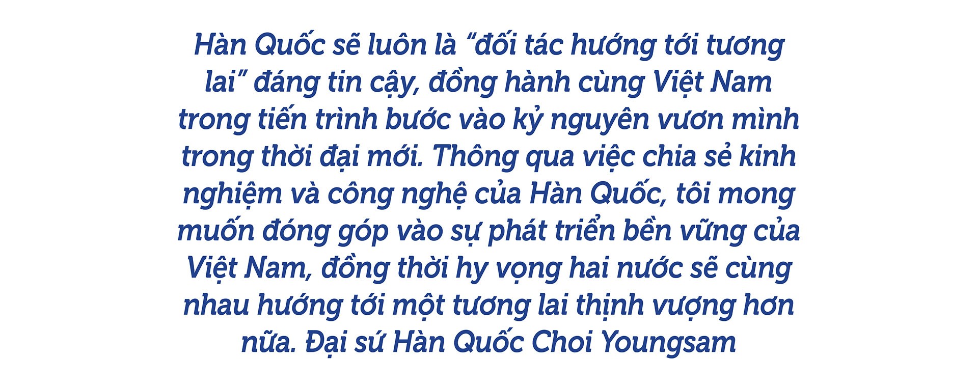 Đại sứ Hàn Quốc Choi Youngsam: Trong thời gian công tác tại Việt Nam, điều tôi cảm nhận sâu sắc nhất là Việt Nam là một quốc gia vĩ đại, hết sức năng động, luôn giữ vững định hướng của mình ngay cả trong dòng chảy của những biến đổi nhanh chóng.