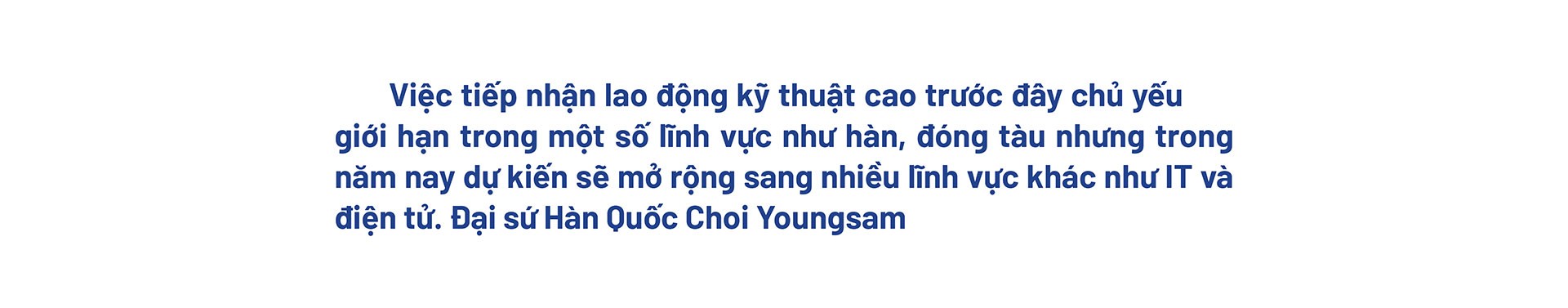 Đại sứ Hàn Quốc Choi Youngsam: Những năm gần đây, số lượng lao động Việt Nam tại Hàn Quốc không ngừng tăng, với phạm vi ngành nghề tiếp nhận ngày càng mở rộng. Người lao động Việt Nam không chỉ được đánh giá cao về sự cần cù mà ngày càng được ghi nhận về năng lực chuyên môn, xu hướng dự báo tiếp tục duy trì trong thời gian tới.