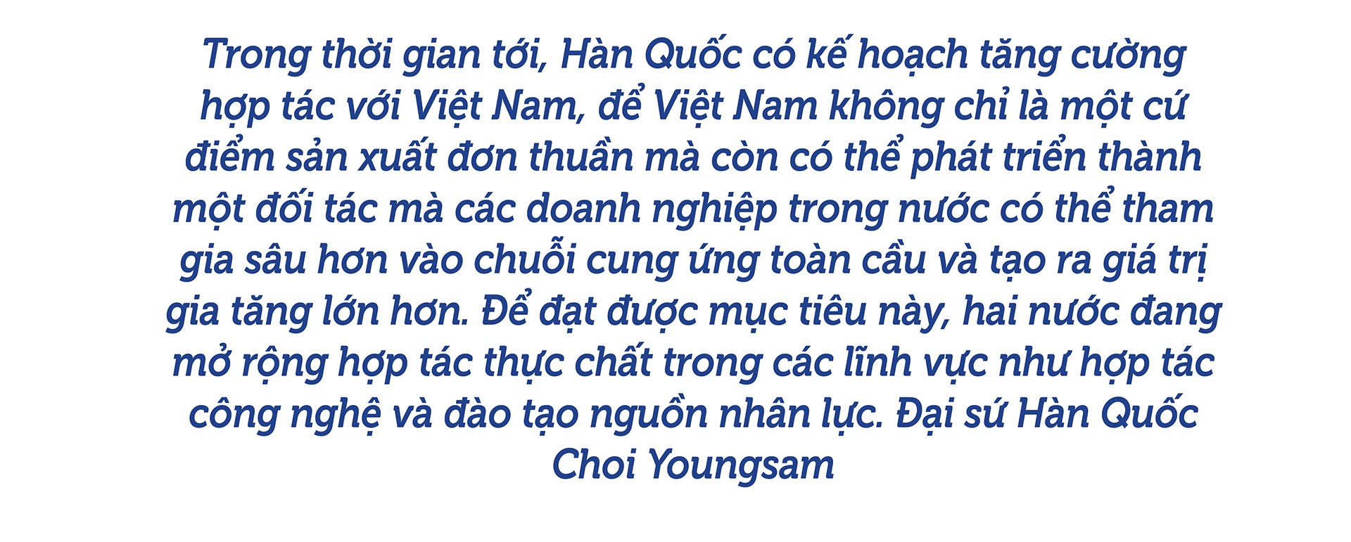 Đại sứ Hàn Quốc Choi Youngsam: Tôi kỳ vọng rằng hợp tác kinh tế song phương trong thời gian tới sẽ được mở rộng sang nhiều lĩnh vực đa dạng như công nghiệp công nghệ cao, công nghệ thông tin, tài chính, năng lượng và cơ sở hạ tầng, cũng như các khoáng sản trọng tâm.