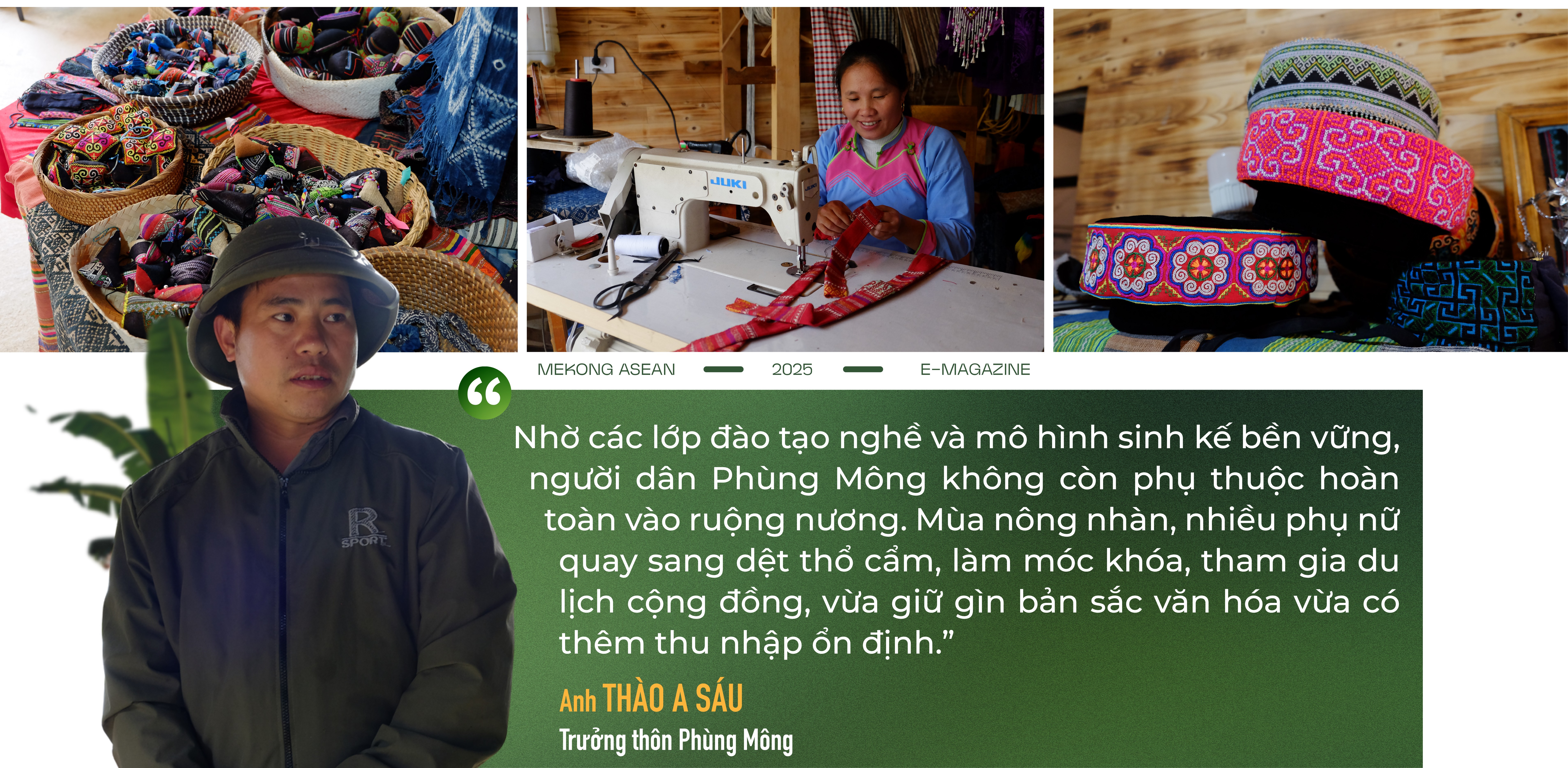 “Giờ nhiều hộ nhận làm hàng thổ cẩm để bán sang Trung Quốc. Bên đặt hàng cung cấp vải, chỉ, mình chỉ làm và nhận công. Một sản phẩm được khoảng 180 đến 300 nghìn đồng, nhưng phải làm hai đến ba ngày mới xong. Thường bên thương lái sẽ tới thu gom tận nơi. Nhiều người dân còn biết cách tận dụng vải thừa để làm móc khóa mang bản sắc dân tộc riêng, từ đó bán cho khách du lịch với giá khoảng 5 đến 10 nghìn đồng. Thu nhập từ đó cũng khá hơn,” anh Sáu vui vẻ kể.