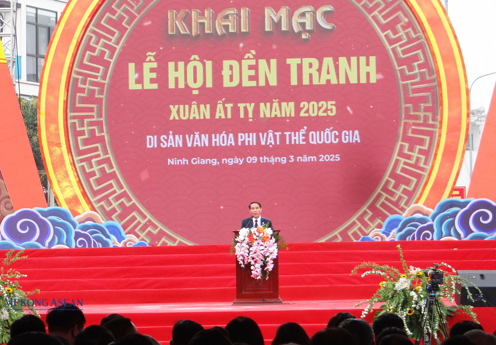 | Ông Nguyễn Thành Vạn, Phó Chủ tịch UBND huyện Ninh Giang, Trưởng Ban tổ chức Lễ hội đền Tranh năm 2025 đọc diễn văn khai mạc lễ hội. |
