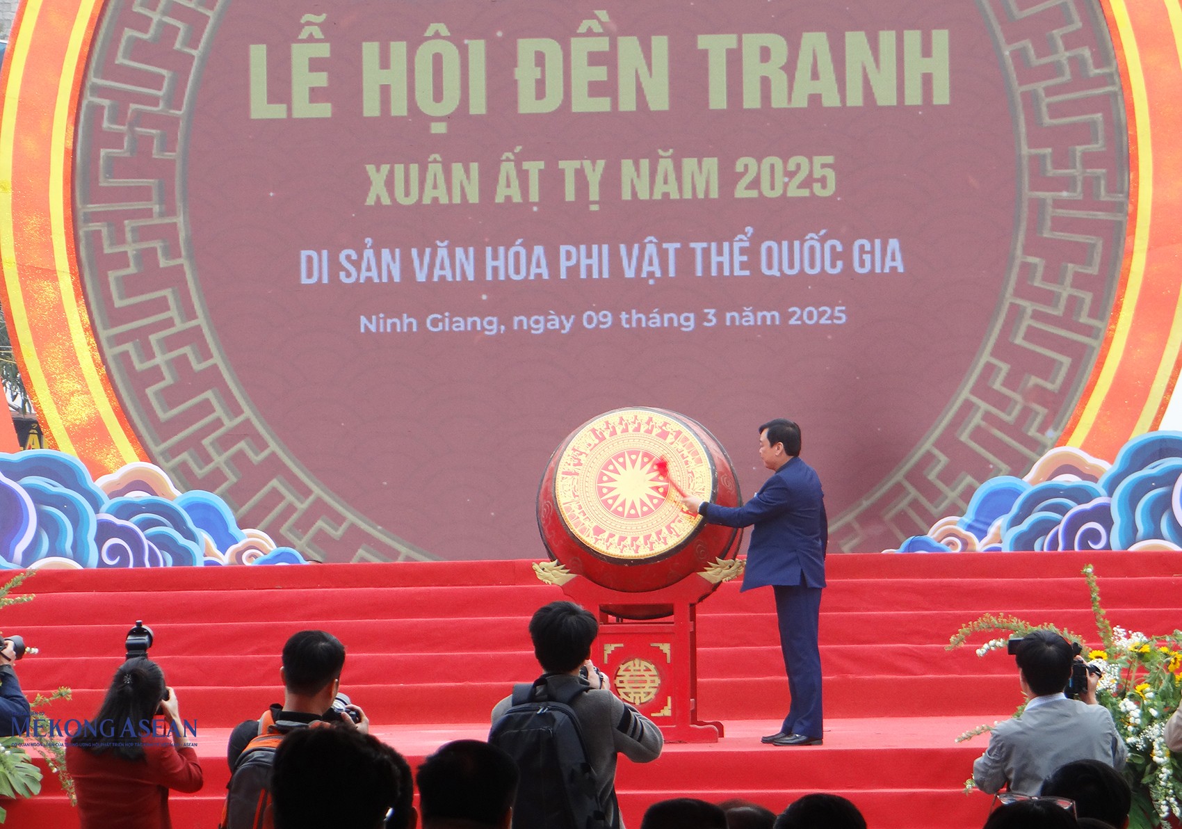 | Ông Phạm Văn Khảnh, Bí thư Huyện ủy Ninh Giang đánh trống khai hội. |