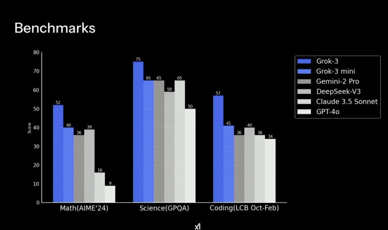 | Điểm tiêu chuẩn toán học, khoa học và mã hoá của Grok-3 so với các mô hình AI khác. Ảnh: xAI. |