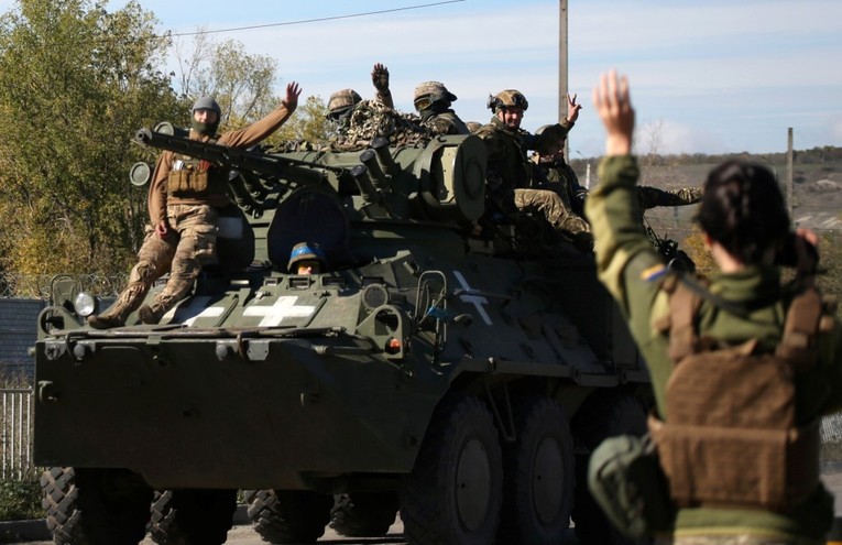 | Binh sĩ Ukraine ngồi trên một xe bọc thép tại thành phố Lyman, tỉnh Donetsk. Ảnh: AFP |