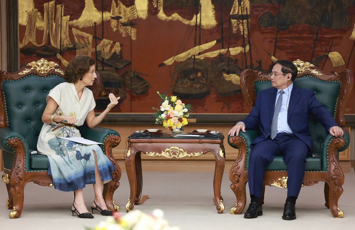 Thủ tướng bày tỏ vui mừng chứng kiến quan hệ Việt Nam - UNESCO ngày càng bền chặt, đi vào chiều sâu, hiểu biết của nhân dân Việt Nam về UNESCO ngày càng sâu sắc; 72 danh hiệu được UNESCO ghi danh là thương hiệu quốc gia rất quan trọng đóng góp cho công cuộc phát triển kinh tế - xã hội bền vững của đất nước; cam kết Việt Nam đã và sẽ tiếp tục đóng góp ngày càng tích cực, hiệu quả, nhất là trên vai trò tại các cơ chế điều hành then chốt của UNESCO. Thủ tướng cảm ơn UNESCO, đặc biệt là cá nhân bà Tổng giám đốc vì những đóng góp cho thúc đẩy quan hệ đối tác Việt Nam - UNESCO trong suốt 2 nhiệm kỳ vừa qua.