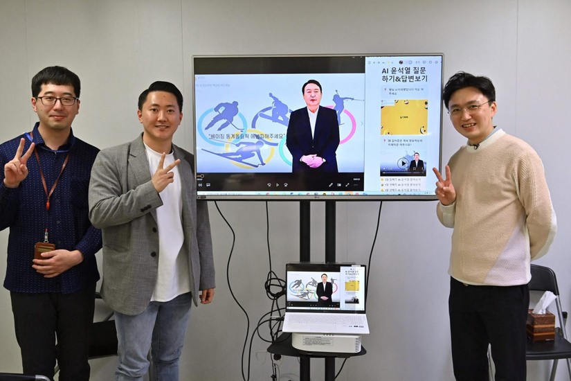 | Baik Kyeong-hoon (phải) cùng nhân viên kỹ thuật trước màn hình hiển thị AI Yoon ở Seoul hôm 7/2. Ảnh: AFP |