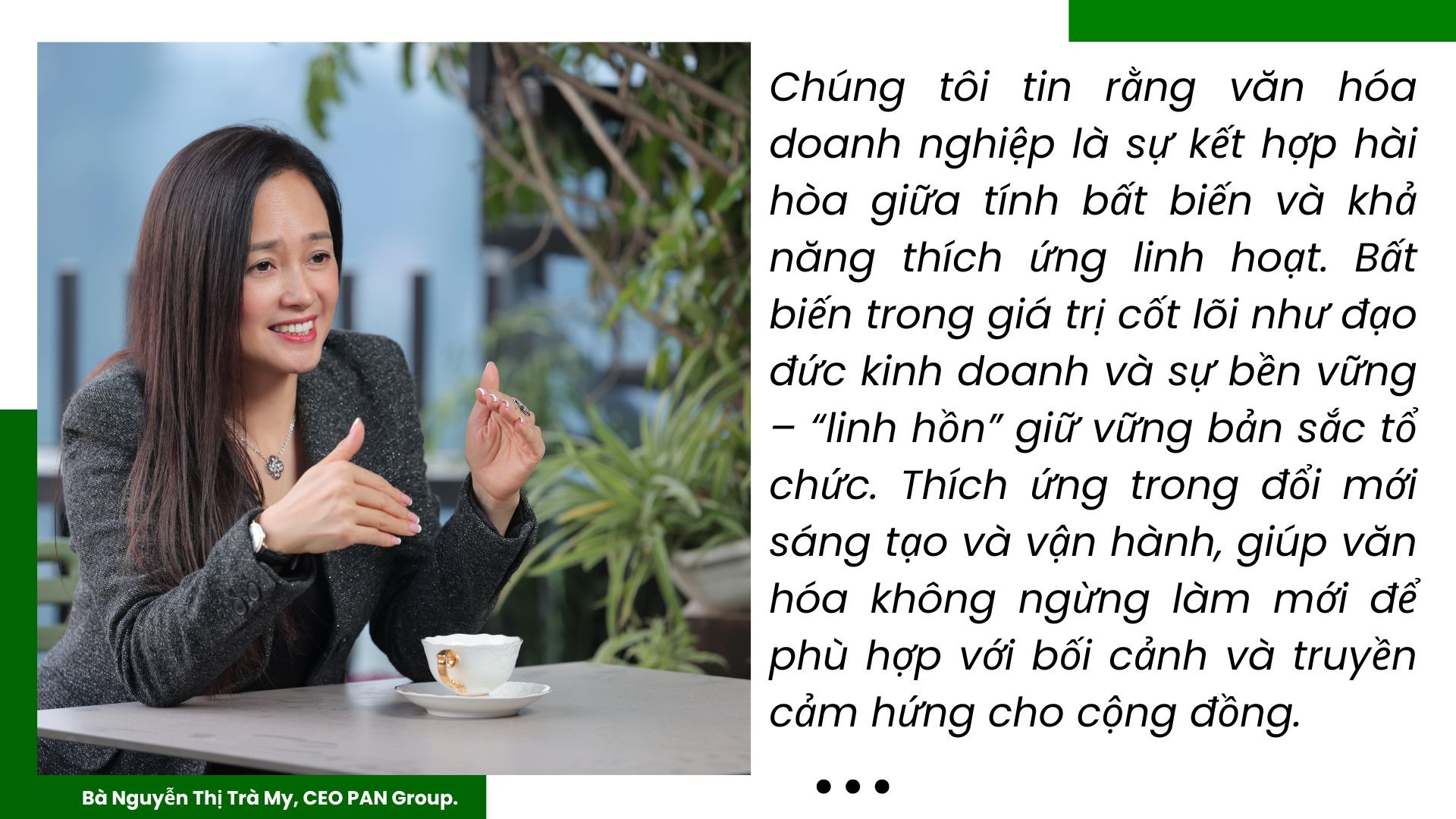 Với hệ sinh thái 11 công ty thành viên, 46 nhà máy trải dài trên cả nước, liên kết với hàng triệu nông dân, văn hóa doanh nghiệp là một trong những định hướng chiến lược được PAN Group tập trung xây dựng để các thành viên tổ chức hiểu rõ giá trị cốt lõi, đồng lòng thực hiện mục tiêu.