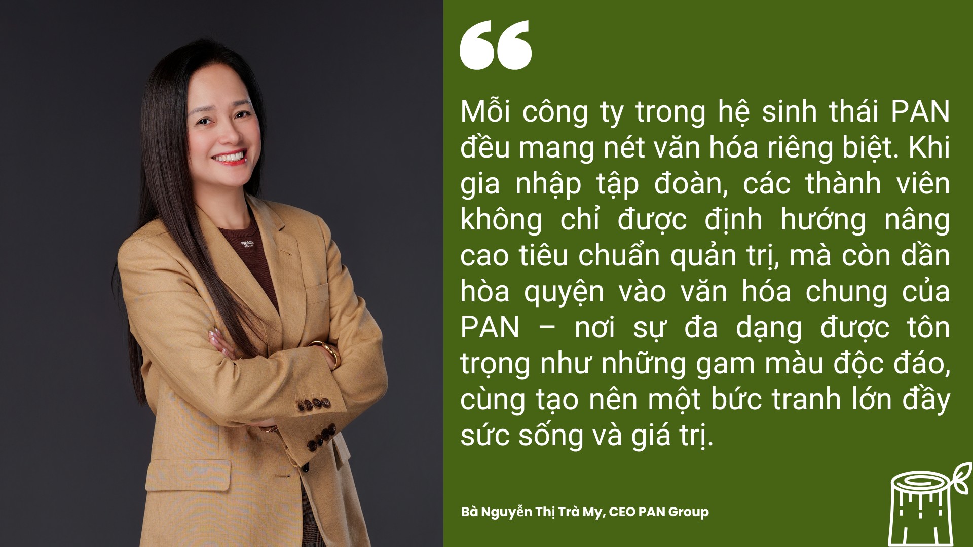 Thực tế, để làm được điều này không dễ, bằng chứng là một nghiên cứu gần đây của hai giáo sư Đại học New York và Đại học Buffalo khảo sát trên 40.000 vụ M&A trong vòng 40 năm qua trên thế giới cho thấy tỷ lệ thất bại hậu M&A lên đến 70 - 75%. Tuy nhiên, nhờ triết lý coi trọng quản trị công ty kết hợp việc sử dụng văn hóa doanh nghiệp như một chất kết dính vô hình, bà Nguyễn Thị Trà My cho biết PAN đã thành công trong hầu hết các thương vụ.