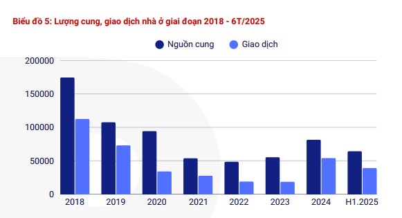 | Lượng cung, giao dịch nhà ở giai đoạn 2018 - 6T/2025. Nguồn: VARS. |
