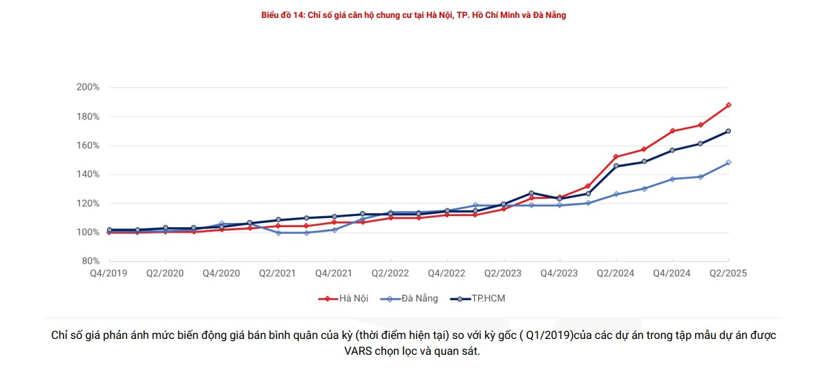 | Chỉ số giá căn hộ chung cư tại Hà Nội, TP HCM, Đà Nẵng. Ảnh: VARS. |