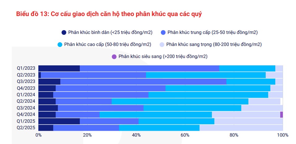 Riêng phân khúc căn hộ chung cư ghi nhận nguồn cung mới tăng gấp đôi so với cùng kỳ, nhưng cơ cấu sản phẩm tiếp tục lệch pha khi các dự án có mức giá trên 80 triệu đồng/m2 tăng mạnh. Căn hộ cao cấp và hạng sang chiếm 62% tổng nguồn cung, tăng 5 % YoY, trong đó phân khúc hạng sang tăng tới 16% YoY.