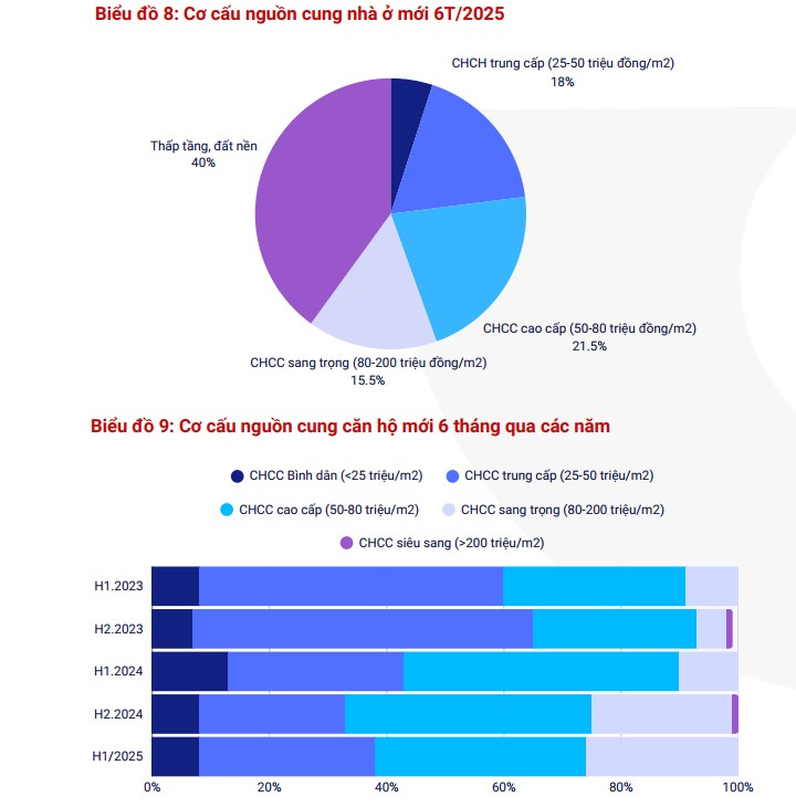 Tính chung 6 tháng, phân khúc thấp tầng chiếm khoảng 40% tổng nguồn cung, tương đương 20.000 sản phẩm, tăng gấp đôi so với cùng kỳ năm 2024. Phân khúc đất nền chiếm tỷ trọng nhỏ do các quy định pháp lý mới siết chặt hoạt động phân lô, bán nền.