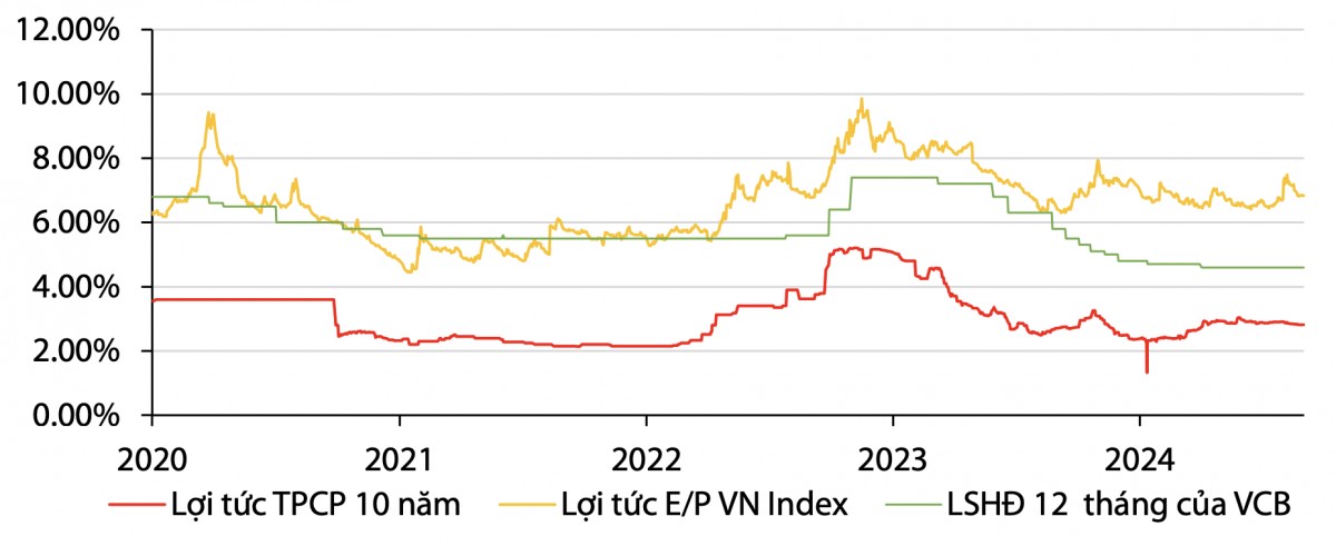 | Tương quan suất sinh lời thị trường chứng khoán, lãi suất trái phiếu Chính phủ 10 năm và lãi suất huy động 12 tháng của Vietcombank. Nguồn: VDSC |
