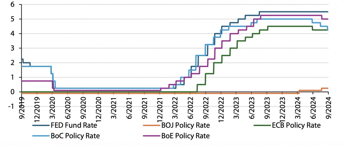 | Lãi suất điều hành của các ngân hàng trung ương lớn. Nguồn: VDSC |