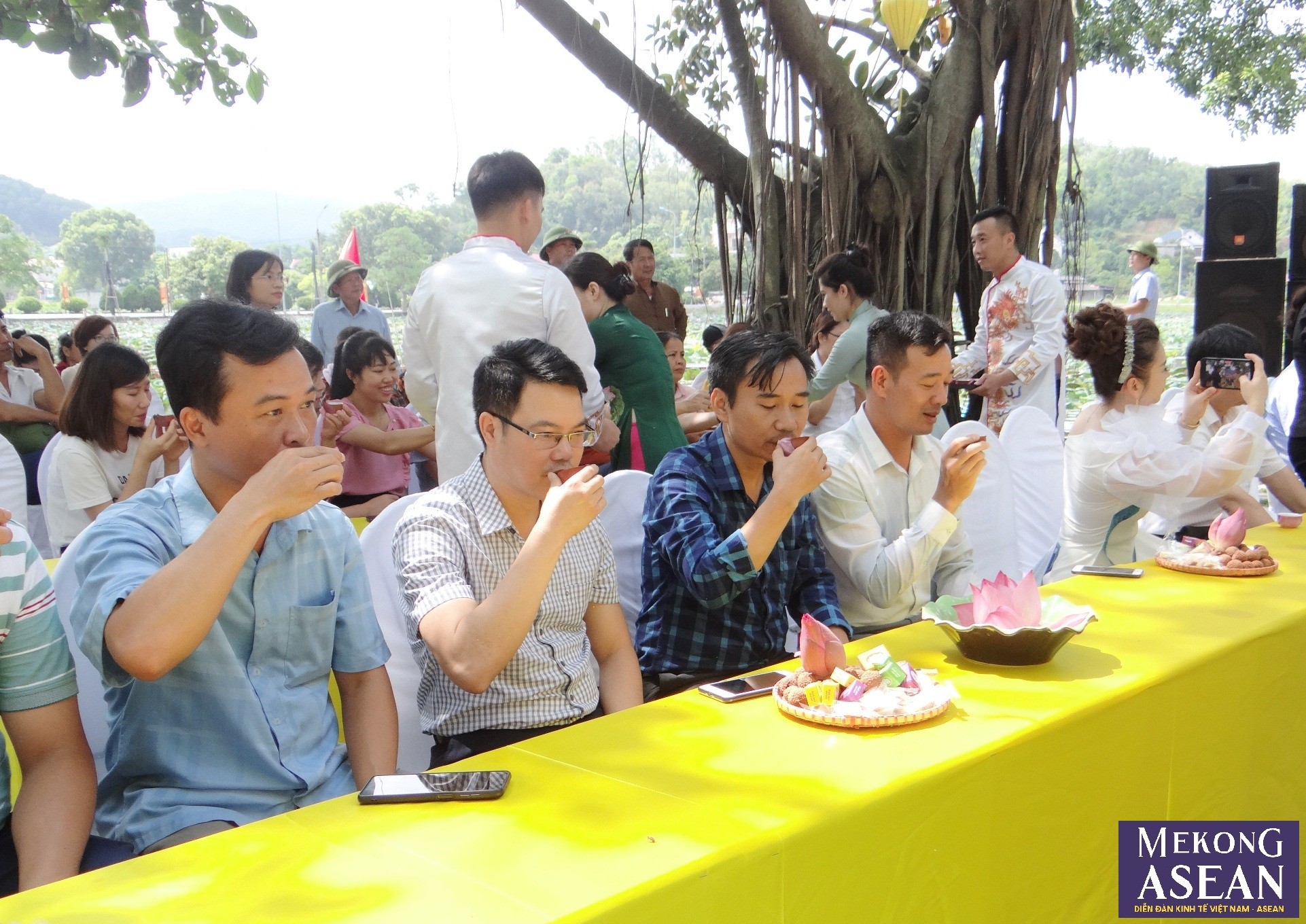 | Đại biểu và du khách thưởng thức trà sen Kiếp Bạc. |
