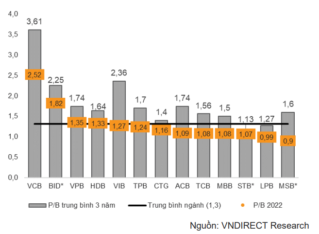 | Hầu hết P/B của các ngân hàng đang dao động dưới mức trung bình 3 năm. Nguồn: Báo cáo triển vọng ngành ngân hàng của VNDirect ngày 21/9 |