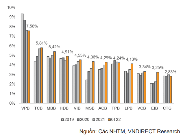 | Hầu hết các ngân hàng đều duy trì tỷ lệ NIM cao ngoại trừ VPB. Nguồn: Báo cáo triển vọng ngành ngân hàng của VNDirect ngày 21/9 |