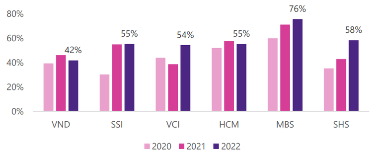 | Đóng góp doanh thu từ môi giới và margin trong tổng doanh thu các công ty chứng khoán. |