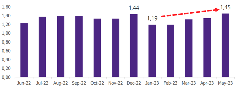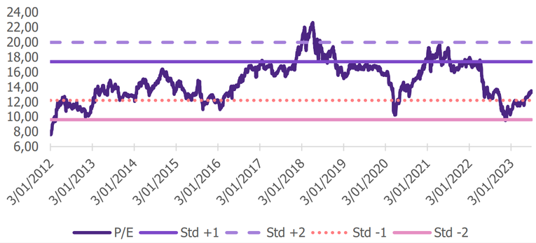 Hiện thị trường đang có sự hồi phục tốt và giao dịch tại mức định giá P/E 13,2 lần, nằm ở dưới mức trung bình 10 năm (14,8 lần). EVS kỳ vọng chỉ số sẽ tiếp tục hồi phục trong nửa cuối 2023 với mức định giá mục tiêu là mức trung bình 10 năm qua; song chỉ số P/E có thể tăng trong thời gian tới do suy giảm về lợi nhuận của doanh nghiệp trong quý 2/2023.