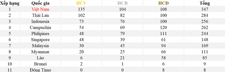 Như vậy, tính đến đến 17h30 ngày 16/5, đoàn thể thao Việt Nam có tổng cộng 135 huy chương vàng, 104 huy chương bạc, 108 huy chương đồng, tạm thời đứng thứ nhất trên bảng tổng sắp SEA Games 32.