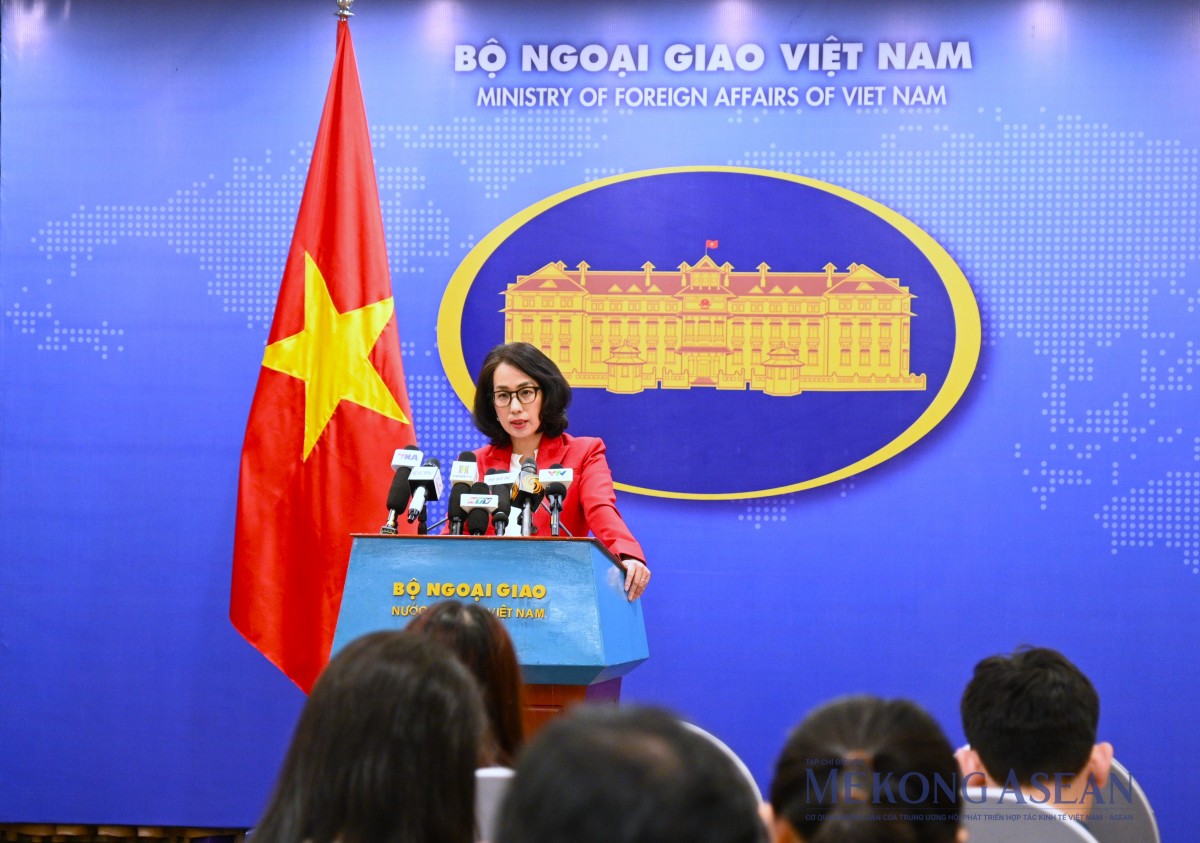| Người phát ngôn Bộ Ngoại giao Phạm Thu Hằng tại cuộc họp báo thường kỳ chiều 24/4. Ảnh: Đỗ Thảo - Mekong ASEAN |