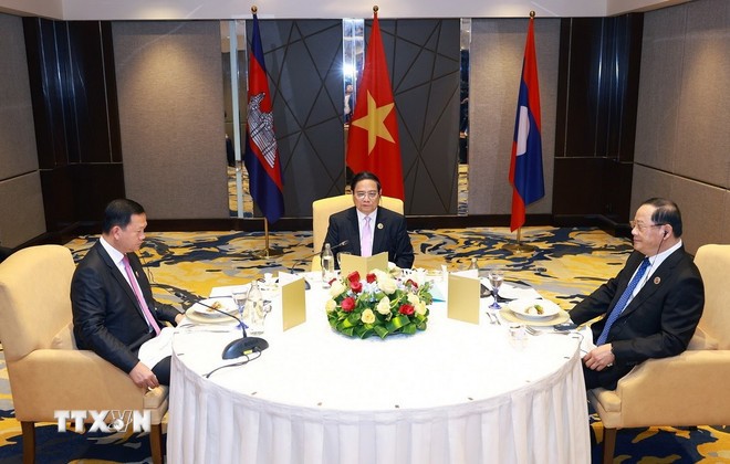 | Thủ tướng Phạm Minh Chính cùng Thủ tướng Lào Sonexay Siphandone và Thủ tướng Campuchia Hun Manet. Ảnh: TTXVN. |