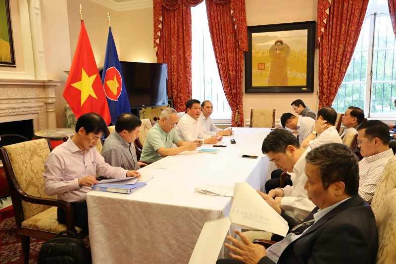 | Bộ trưởng Nguyễn Hồng Diên, Trưởng đoàn đàm phán Chính phủ chủ trì họp với đại diện các thành viên đoàn đàm phán và các bộ phận liên quan trước và sau ngày làm việc đầu tiên. Nguồn: Bộ Công Thương. |