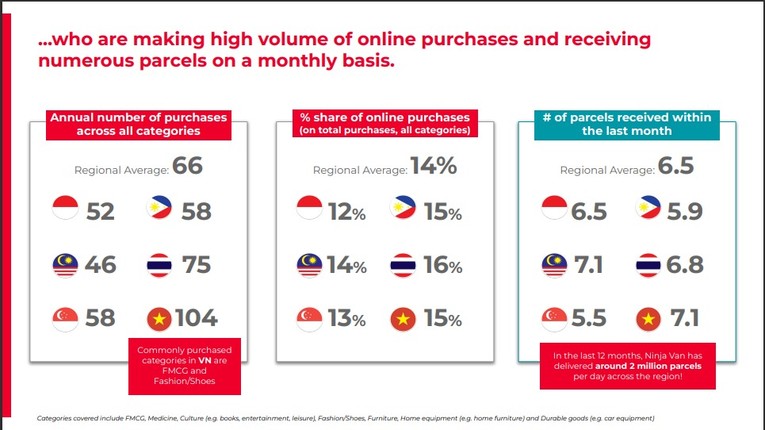| Cụ thể, người Singapore mua khoảng 52 đơn, Philippines 58 đơn, Thái Lan 75 đơn mỗi năm. Ảnh: DPC & Ninja Van. |