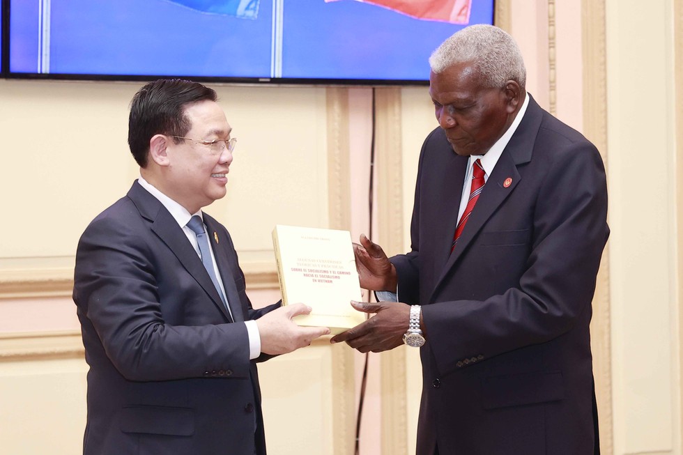 Nhân dịp này, Chủ tịch Quốc hội Vương Đình Huệ đã trao tặng cuốn sách “Một số vấn đề lý luận và thực tiễn về chủ nghĩa xã hội và con đường đi lên chủ nghĩa xã hội Việt Nam” của Tổng bí thư Nguyễn Phú Trọng đến Chủ tịch Quốc hội Cuba.