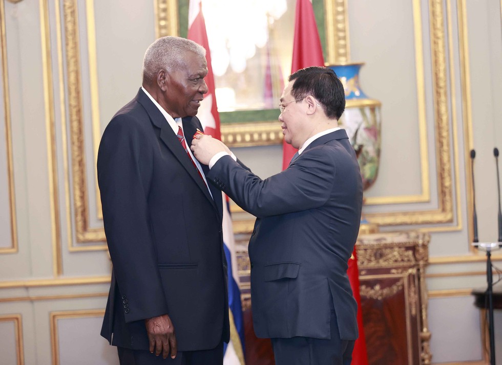 | Chủ tịch Quốc hội Vương Đình Huệ trao Huân chương Hồ Chí Minh của Đảng, Nhà nước Việt Nam tặng Chủ tịch Quốc hội Cuba Esteban Lazo Hernández. Ảnh: Quốc hội Việt Nam |