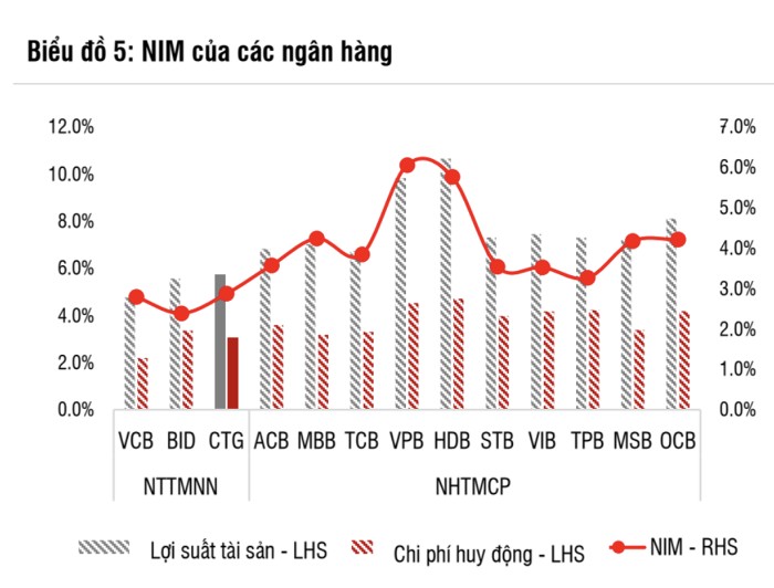 Đồng thời, SSI cho rằng VietinBank sẽ tiếp tục giữ lãi suất cho vay ở mức hợp lý để hỗ trợ nền kinh tế, dù lãi suất huy động có thể nhích nhẹ trong nửa cuối năm 2025. Trong quý 4/2024, NIM của VietinBank giảm 0,2 điểm % so với quý trước, xuống mức 2,87%, do ngân hàng duy trì lãi suất cho vay thấp đối với các khoản giải ngân mới nhằm hỗ trợ khách hàng. Điều này cũng khiến tỷ suất sinh lời trên tài sản giảm xuống 5,71%.