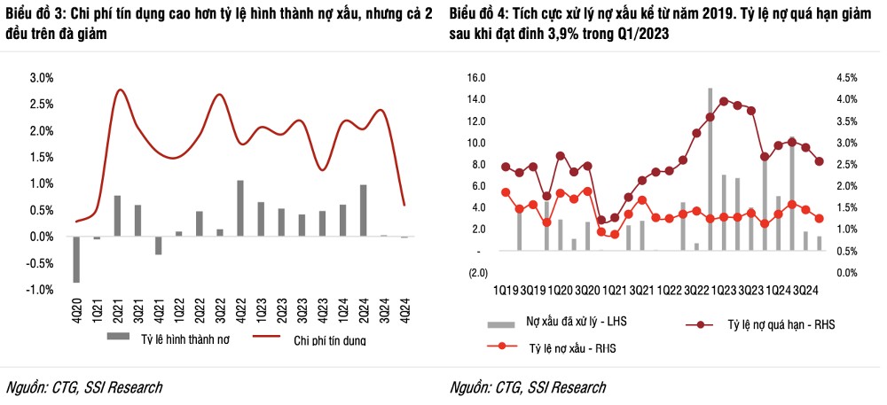 Báo cáo của SSI cho thấy chất lượng tài sản của VietinBank có nhiều cải thiện trong quý 4/2024. Tỷ lệ nợ xấu giảm xuống 1,25% nhờ việc xử lý 1.300 tỷ đồng nợ xấu, giúp tổng nợ xấu giảm 7,5% so với quý trước. Đồng thời, nợ nhóm 2 cũng giảm 1,5%.