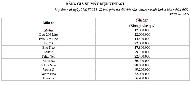 VinFast khởi động chiến dịch tri ân khách hàng từ ngày 22/5/2025 nhằm tạo cơ hội tiếp cận xe điện cho khách hàng trong nước với mức ưu đãi 4% cho tất cả người dân tại Việt Nam khi mua xe ô tô và xe máy điện. Đây là sự mở rộng từ chính sách khách hàng thân thiết trước đó chỉ dành cho cán bộ, công nhân viên chức của các địa phương, doanh nghiệp, đối tác của VinFast.