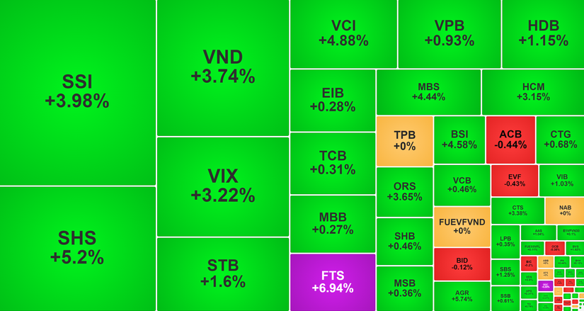 Đóng góp lớn nhất cho chiều tăng của chỉ số là nhóm chứng khoán, với mức vốn hóa tăng mạnh nhất thị trường (gần 4%). FTS tăng trần, VND tăng 3,7%, SSI tăng 4%, VIX tăng 3,2%, VCI tăng 4,9%, VDS tăng 3,9%, SHS tăng 5,2%, MBS tăng 4,4%, HCM tăng 3,2%, BSI tăng 4,6%...