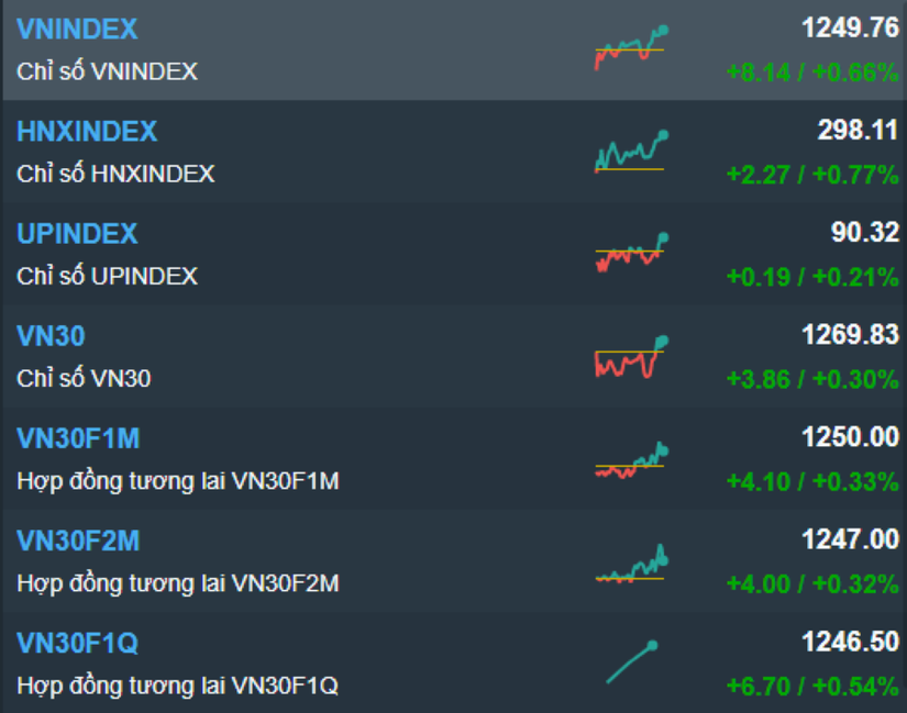 Diễn biến của VN-Index hôm nay khá giống phiên hôm qua, đó là chỉ số giằng co ở ngưỡng tham chiếu trong suốt phiên sáng và đầu phiên chiều. Nhưng từ sau 14h, lực mua tung ra mạnh mẽ giúp thay đổi cục diện. Với việc tăng hơn 8 điểm, VN-Index chỉ còn cách chút xíu nữa là chinh phục ngưỡng 1.250 điểm. HNX-Index cũng tăng 2,2 điểm, còn UPCoM tăng 0,2 điểm. Thanh khoản vẫn giữ ở mức cao với tổng giá trị giao dịch đạt 20.155 tỷ đồng.