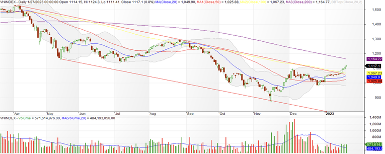Kết phiên giao dịch đầu tiên của năm mới Âm lịch, ngày 27/1, VN-Index tăng 9,02 điểm (+0,81%) lên mức 1.117,1 điểm, HNX-Index tăng 0,89 điểm (+0,4%) lên mức 220,76 điểm. UPCoM tăng 1,01 điểm (+1,37%) lên 74,99 điểm.