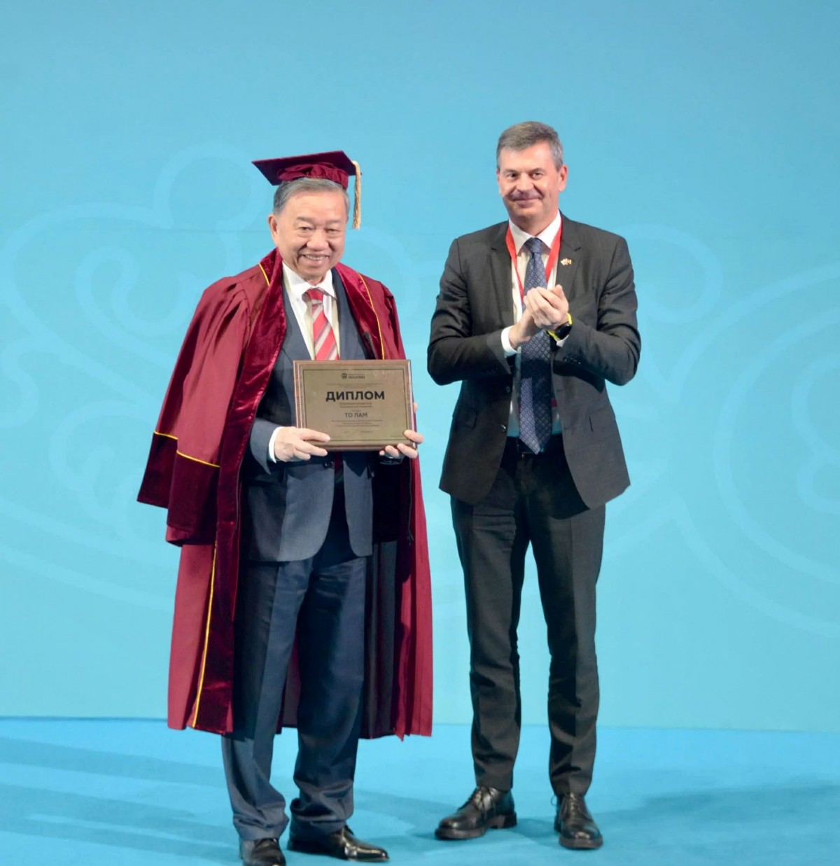 Nhân dịp này, Hiệu trưởng RANEPA Alexey Gennadievich Komissarov đã trao tặng Tổng Bí thư Tô Lâm danh hiệu “Giáo sư danh dự” của Học viện. Ông cũng trao tặng Bản sao Luận án “Hoạt động của Đảng Cộng sản Việt Nam nhằm tăng cường mối quan hệ với quần chúng trong giai đoạn hiện nay (dựa trên kinh nghiệm của Đảng Cộng sản Liên Xô) của cố Tổng Bí thư Nguyễn Phú Trọng, bảo vệ năm 1983”.