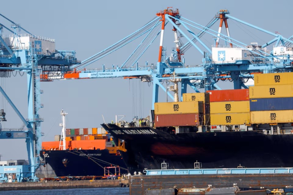 | Một tàu chở hàng đậu bên ngoài nhà ga hàng hải Cảng Elizabeth, Mỹ, ngày 9/4. Ảnh: Reuters |