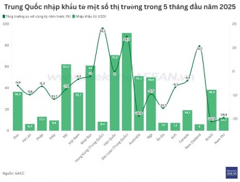 Theo số liệu công bố ngày 10/6 của Tổng cục Hải quan Trung Quốc (GACC), 5 tháng đầu năm 2025, tổng kim ngạch xuất nhập khẩu giữa Trung Quốc và các nước ASEAN đạt tổng 420,4 tỷ USD, tăng 7,8% so với cùng kỳ năm trước (YoY). Cụ thể, xuất khẩu của Trung Quốc sang ASEAN đạt 264 tỷ USD, tăng 12,2% YoY; nhập khẩu từ ASEAN 155,8 tỷ USD, tăng 1,2% YoY.